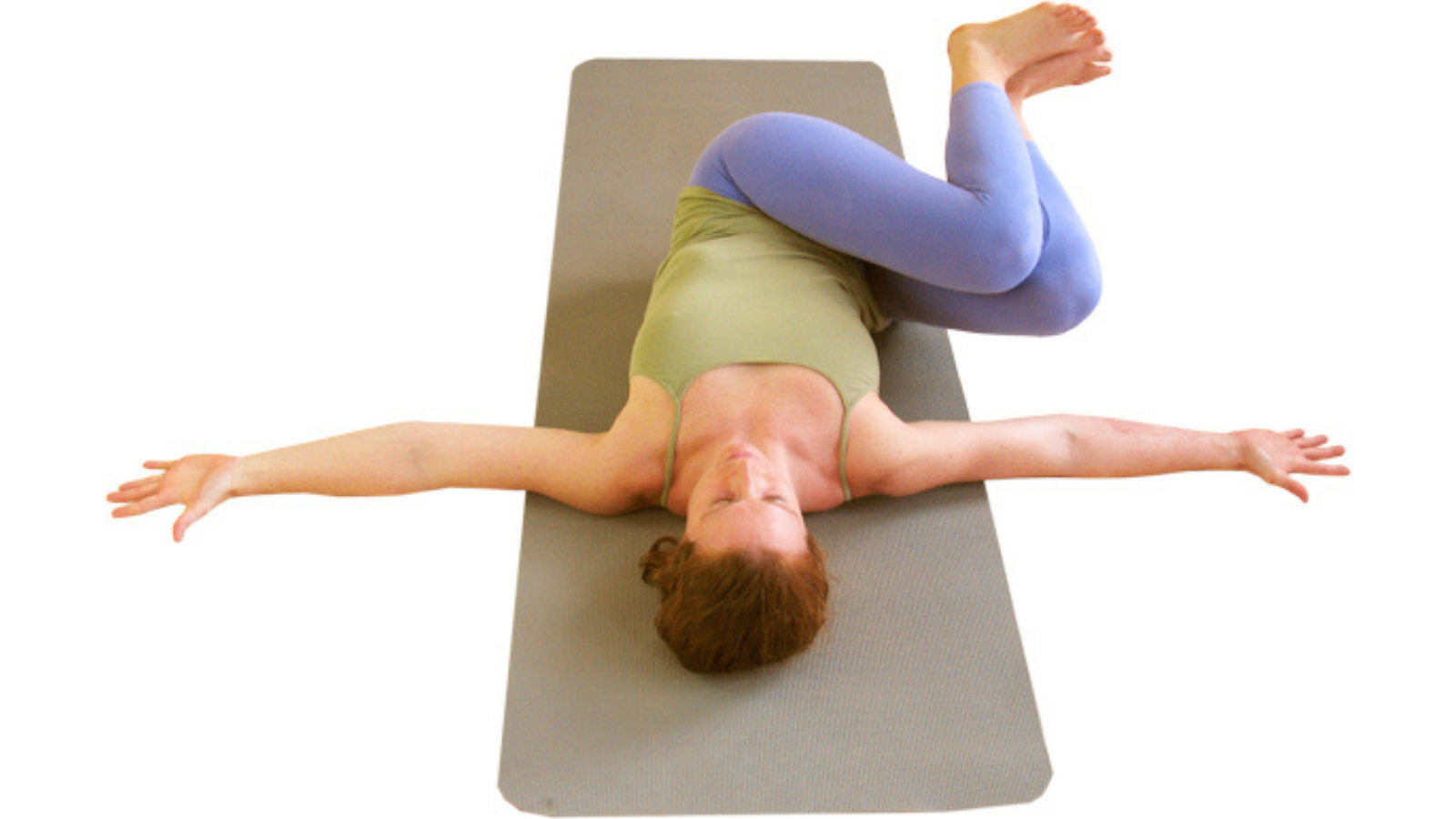 While twisting poses are often contraindicated for lower back problems, this supine twist will help relieve tension in the spine safely when the abdominal muscles are fully engaged. Therefore, keep your knees close to your chest and begin by taking the knees halfway to the right or less. This pose helps release tension through all the small muscles and joints of the spine.