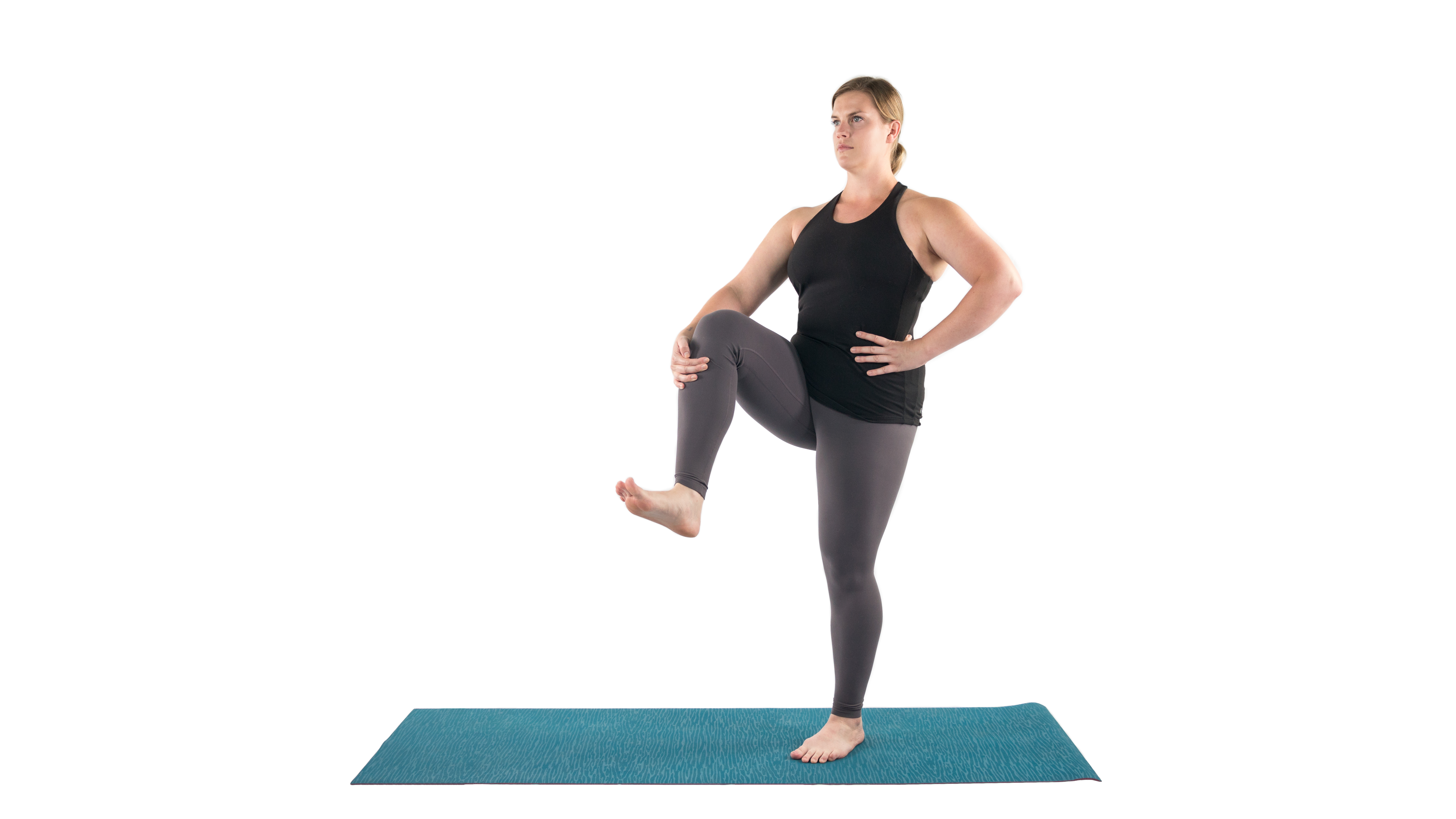 Holding the strap encourages the muscles of the upper back to engage, opening the chest and allowing for a more vertical spine. A strap from the lifted thigh to the standing foot can be a useful tool in maintaining pelvic alignment.
